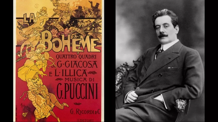 Photo : Affiche de La vie de Bohême par Adolphe Hohenstein, Milan 1895. À droite, portrait de Giacomo Puccini en 1908. Rue des Archives Via le Figaro